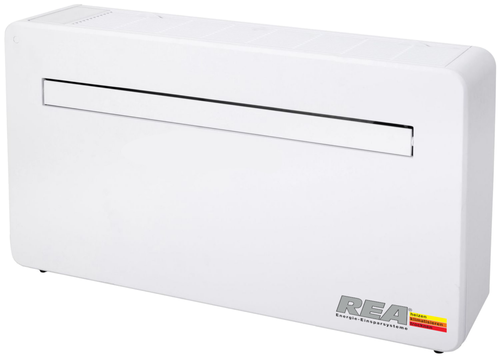 Bei den „Split“-Geräten ohne Außeneinheit wird die notwendige „Außen-Einheit“ nach innen ins Gerät verlegt. Benötigt werden lediglich zwei Wandbohrungen mit 162 mm Durchmesser. Die Wärmepumpentechnologie ermöglicht eine nominale Kälteleistung, die ca. 2,5 fach über dem eingesetzten Stromverbrauch liegt: je nach Modell z.B. 2.3 kW Kälteleistung bei 0,9 kW Stromverbrauch.